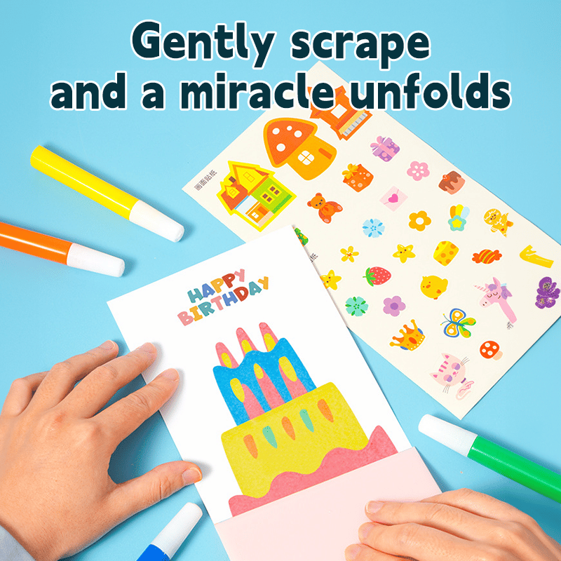 Let your child discover the magic of scratch art with the Magic Reveal Craft Kit! This isn’t just any craft kit; it’s an interactive way to bring rainbow colors to life with a simple scratch-and-reveal process.