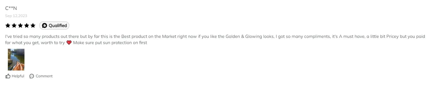 I've tried so many products out there but by far this is the Best product on the Market right now if you like the Golden & Glowing looks, I got so many compliments, it's A must-have, a little bit Pricey but you paid for it it what you get, worth to try ❤️ Make sure put sun protection on first.————— Christine TRAN 2023.9.12