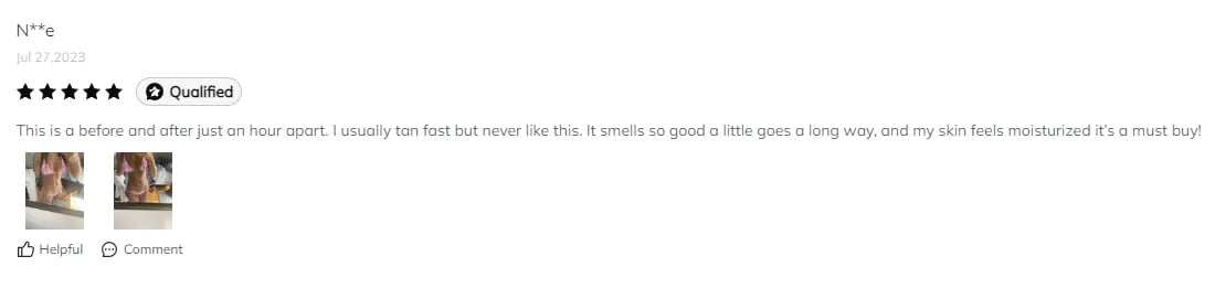 This is a before and after just an hour apart. I usually tan fast but never like this. It smells so good a little goes a long way, and my skin feels moisturized it’s a must-buy! ————— Nicole 2023.7.27